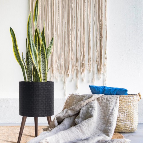 D’vine Dev 12 Inch Modern Geometric Tile Patterned Sleek Planter Pot with Stand, Indoor Outdoor Decorative Plant Holder, Distressed Black, 88-Z-C-5