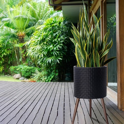D’vine Dev 16 Inch Modern Geometric Tile Patterned Sleek Planter Pot with Stand, Indoor Outdoor Decorative Plant Holder, Distressed Black, 88-Z-E-5