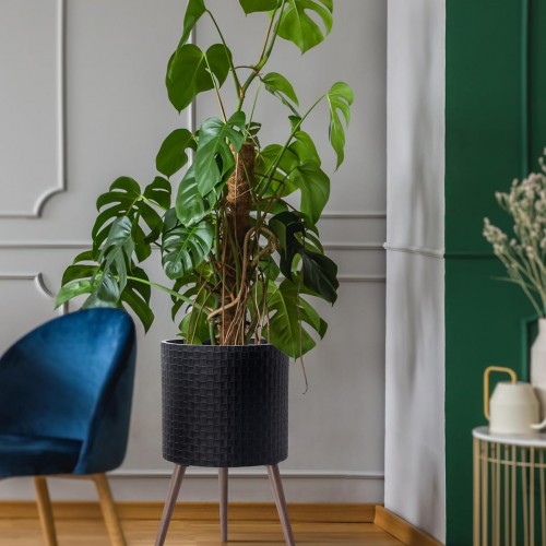 D’vine Dev 16 Inch Modern Geometric Tile Patterned Sleek Planter Pot with Stand, Indoor Outdoor Decorative Plant Holder, Matte Black, 88-Z-E-2