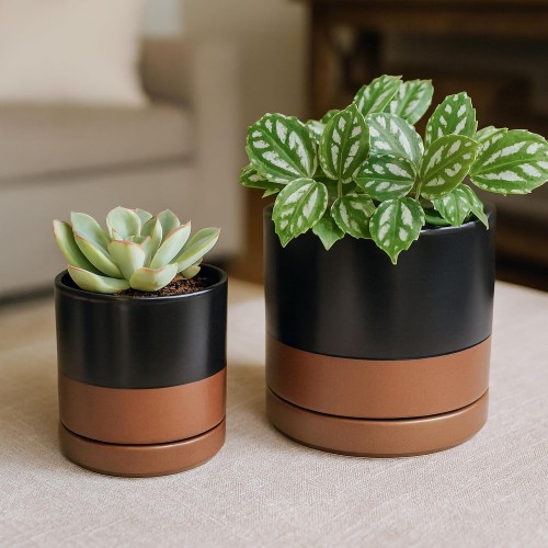 D’vine Dev 3.5 Inch & 4.7 Inch Ceramic Planter Pots for Plants with Drainage Hole and Saucer, X-Small Plant Pots Set, Black/Speckled Tan, 94-G-XS-7