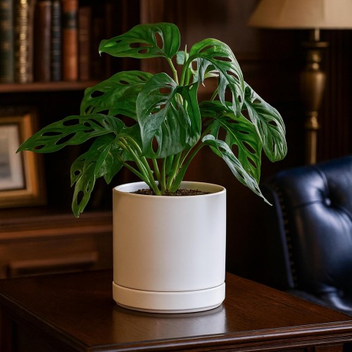 - Simple, elegant, and modern cylindrical straight round planter pot with saucer and drainage hole.