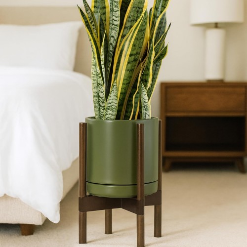 D’vine Dev Ceramic Planter with Walnut Color Stand – 10 Inch Modern Round Flower Pot with Wood Planter Holder, Olive, 55-B-X-J
