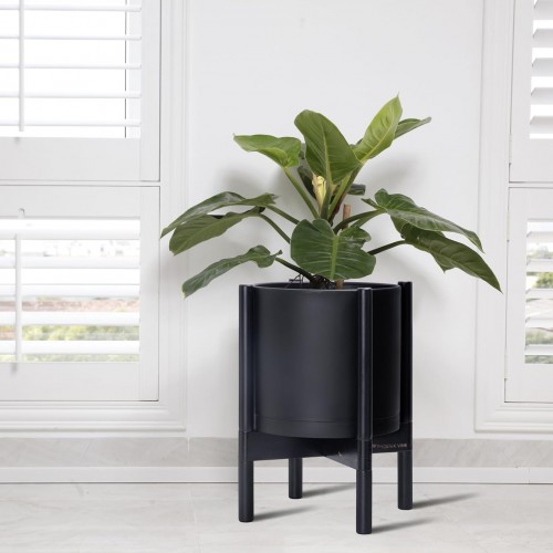 D’vine Dev Planter Pot with Stand – 10 Inch Plastic Cylinder Flower Pot with Wood Planter Holder for Indoor, Matte Black Pot + Ebony Stand, 55-C-N-2