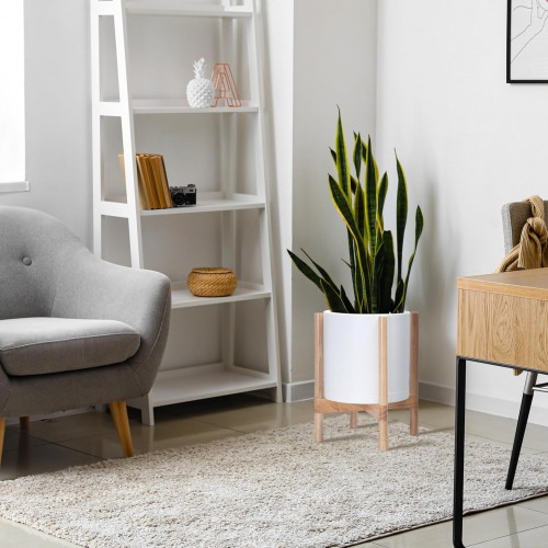 D’vine Dev Planter Pot with Stand – 12 Inch Plastic Cylinder Flower Pot with Wood Planter Holder for Indoor, Matte White Pot + Natural Stand, 55-C-P-1