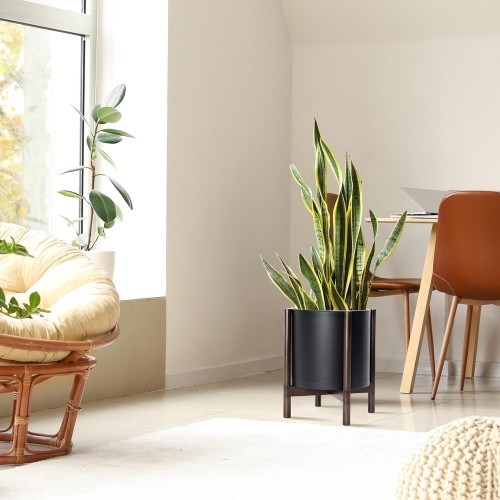 D’vine Dev Planter Pot with Stand – 14 Inch Plastic Cylinder Flower Pot with Wood Planter Holder for Indoor, Matte Black Pot + Walnut Color Stand, 55-C-R-2
