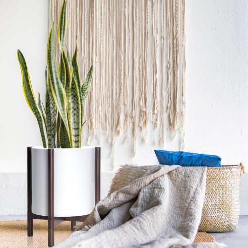 - A Complete Set: Minimalist plastic planter, combined with a sculptural, solid wood stand that match perfectly together and looks great in any home.