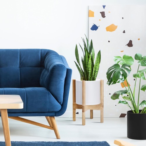 D’vine Dev Planter Pot with Stand – 8 Inch Plastic Cylinder Flower Pot with Wood Planter Holder for Indoor, Matte White Pot + Natural Stand, 55-C-J-1