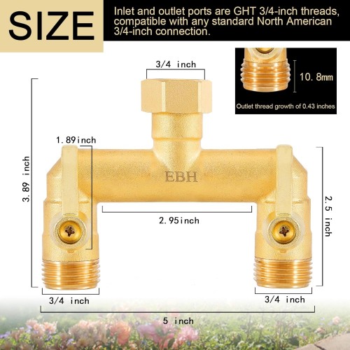 EBH Garden Hose Splitter, Full Flow Outdoor Faucet Splitter, 2-Way High Flow Brass Heavy Duty Hose Splitter with Long Metal Handle。