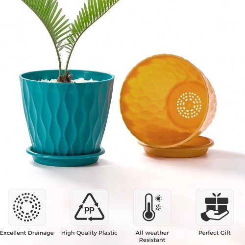 FaithLand 6-Pack 6-Inch Plastic Plant Pots with Saucers | Thickened PP Material, Modern Wave Texture, Enhanced Drainage for Indoor/Outdoor Garden Plants | Multicolor Value Set
