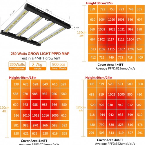 - 【Efficient Heat Dissipation and No Noise】Our grow lights are made of 4 lightweight aluminum bars, which has efficient heat dissipation and cooling functions.it’s powerful heat dissipation ability that no need to buy more cooling devices.This led plant light has no fan, there will be no noise.it is very light weight and IP67 waterproof,so it’s easy to carry and install.