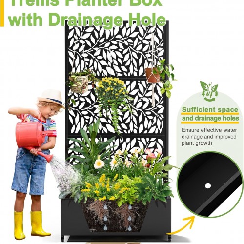 FENCY Metal Raised Garden Bed with Wheels and Trellis,73″x35″x16″ Planter Box for Climbing Plants, Vegetables & Vines, Features Privacy Screen and Drainage Holes (Black-Leaf-2)