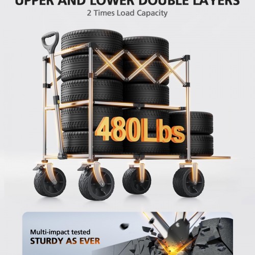 Foldable Wagon Cart,Everyfun 480Lbs Double Decker Wagon,Beach Carts with Big Wheels&Side Pocket&Dustbag,Large Capacity Folding Wagon for Shopping,Garden,Camping,Fish,New Wave Sports Wagon-Brown