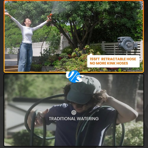 - High Grid Garden Hose: The hose reel is made to be long-lasting and leak-proof with all-weather flexible and abrasion-resistant hybrid hose. Both the 200 PSI pressure test and the 600 PSI bursting pressure test were successfully completed by the 155-foot, 1/2-inch retractable hose.