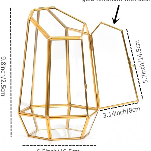- STUNNING GOLD GEOMETRIC TERRARIUM WITH DOOR:This golden geometric glass terrarium features a unique irregular prism design, perfect as a modern home decor centerpiece or wedding table decoration. Its elegant gold brass frame and clear glass create a luxury fairy garden display for succulents, air plants, or dried flowers.