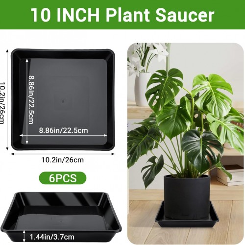 GREANER 6 Packs Square Plant Saucer, Plant Water Dray Tray, Durable Thick Plant Pot Dish for Flower Pot, Plastic Plant Tray to Catch Water for Indoor Outdoor(10 Inch, Black)