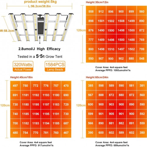 - 【Max Coverage Area Plant Lamp Full Spectrum】320W Full spectrum (380-410 nm, 660-665nm, 730nm,3200-4200K,4800-5000K) is perfect for veg to grow,6 LED grow lights bars , it can provide evenly distributed light intensity.It can coverage for 4x4ft of high-yielding full-cycle growth.