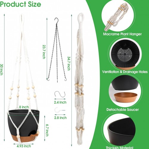 Hanging Planters for Indoor Outdoor Plants, 2 Pack Self Watering Hanging Pot with Drainage Holes, Removable Tray & 2 Kinds of Plant Hangers, 8” Hanging Flower Pots for Home Garden Decor, Black