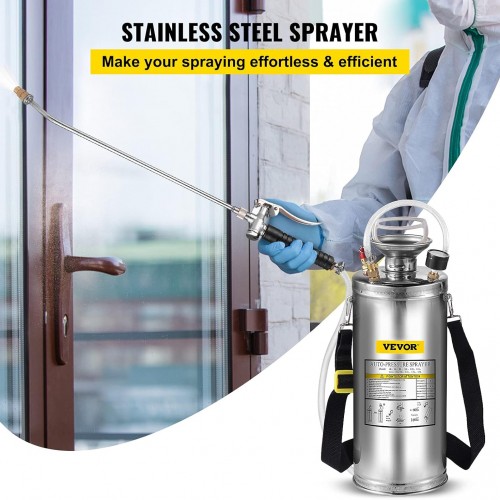 - Durable Stainless Steel: Capacity: 2 Gal; Pressure: 1.5-4.0 Bar. Our hand pump sprayer is made of stainless steel, rust-proof and durable. Pay attention that the rubber ring and internal design are not suitable for strong corrosive, acidic, and base solutions.