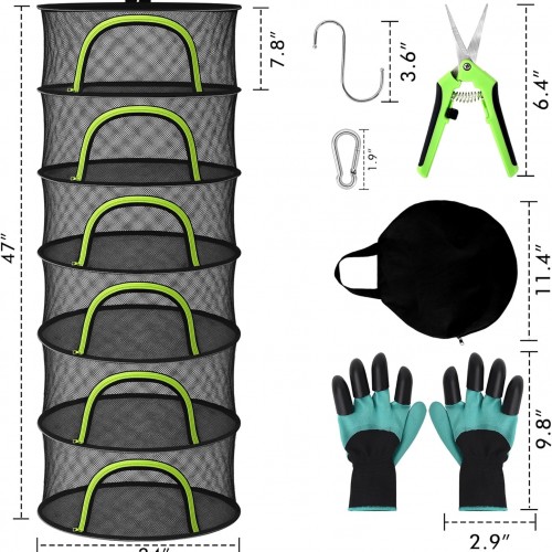 Herb Drying Rack Hanging Mesh 6 Layer 24″ with Zipper, Gloves, Garden Pruning Shear, Hook & Carabiner Clip for Drying Herbs, Plants, Seeds, Buds | Outdoor, Hydroponics Herb Dryer Hanging Rack
