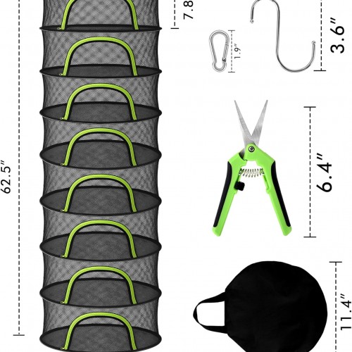 Herb Drying Rack Hanging Mesh 8 Layer 24″ with Zipper, Garden Pruning Shear, Hook & Carabiner Clip for Drying Herbs, Plants, Seeds, Buds | Hydroponics & Grow Tents Herb Dryer Hanging Rack