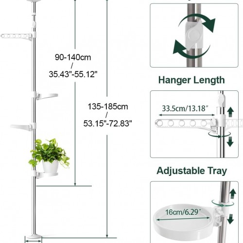 - The height has two size ranges and can be adjusted according to the size of the home. Height: 90-140cm/35.43-55.11inches; 135-185cm/53.14-72.83inches ; The tray’s inside diameter is about 16cm (6.29inches).