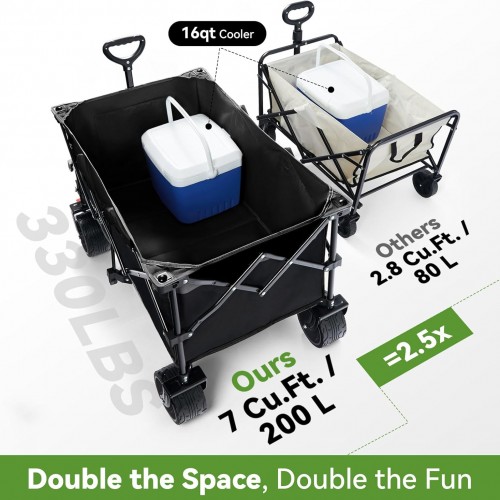 - 𝐋𝐀𝐑𝐆𝐄𝐑, 𝐌𝐀𝐘𝐁𝐄 𝐋𝐀𝐑𝐆𝐄𝐒𝐓 – You could hardly find a larger one. Our beach wagon with surprisingly enlarged capacity of 7 cubic feet / 200L is designed to be a real carryall. With a deeper and larger storage space, our wagon cart features 3-4 times the capacity of a 24-inch suitcase or 5-7 times of a 20-inch suitcase. Just load it with everything you need and enjoy a nice adventure in the sun!