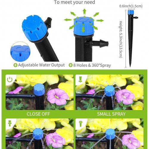 - Adjustable Water Flow: The drip emitter can be adjusted to stop, micro-drip, and spray so that you can use the water drip system to water many kinds of plants in your garden. Moreover, the drip emitters have a support stake for easy placement in the soil