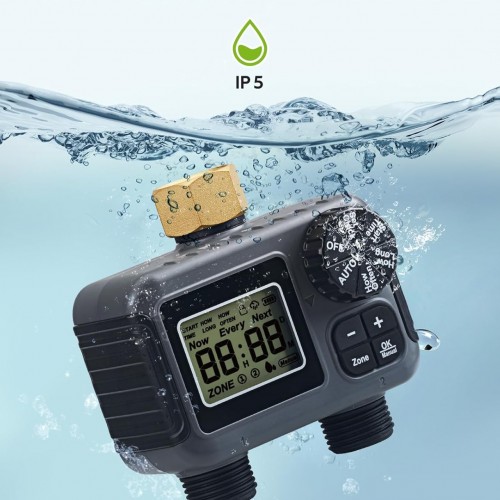 - 2 Zone Programmable Water Timer: Hose timer with 2 outlets, easy to customize watering schedules for each zone. Have full control over watering all areas of your yard and lawn, ensuring even, efficient, and easy watering