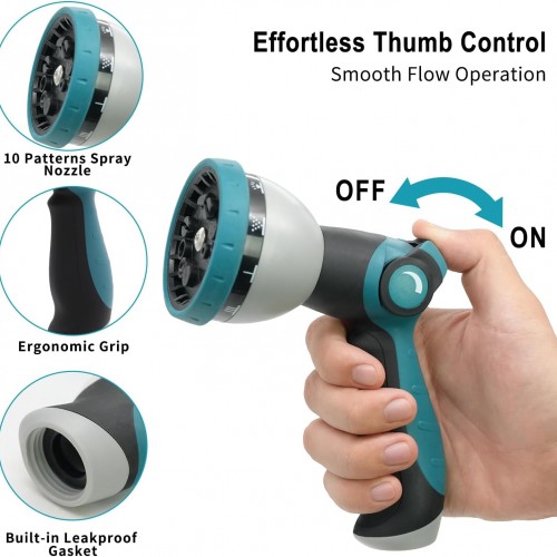 - THUMB CONTROL DESIGN: This nozzle was designed to operate effortlessly simply by pushing the switch up with your thumb to turn it on and control the water flow.