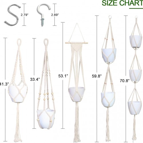 - Package Include: Each package includes 5 different style hanging plant holders, 5 pcs of ceiling hooks and 5 pcs of S hooks,suitable for hanging plant. The macrame plant hangers with different sizes, the length of each is approximately: 70.8”/59.8”/53.1”/41.3”/33.4”, and the ceiling hooks are 2.89inch, the S hooks are 2.79inch. (Plant and pots are not included),just only crochet plant hangers/hanging plant holder indoor make your garden or bedroom more active.Macrame pot holder is good for you
