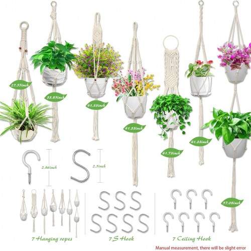 - 【Package Include】IGaiety macrame plant hanger set come with 7 different size plant hanger rope, approximate length: 27.55″/33.85”/41.33”/57.08”, each macrame plant hanger set include 7pcs S hooks and 7pcs ceiling hooks,easy to use.This plant hanger will fit a variety of flower pot shapes and sizes,including ceramic pots, metal pots, plastic pots, glass pots, glass pots, etc.Handmade weave techniques and pure cotton make the plant hanger more durable, soft and flexible.
