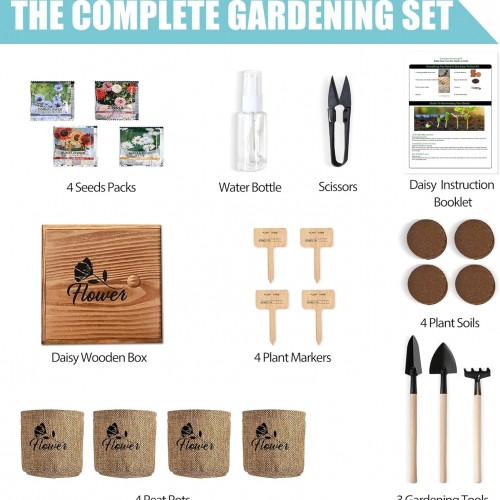 Indoor Starter 4 Kit with Complete Gardening Kit & Wooden Box, Growing into Shasta Daisy, Cornflower, Sunflower, Zinnia