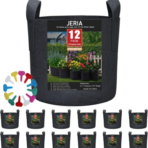JERIA 12-Pack 15 Gallon, Vegetable/Flower/Plant Grow Bags, Aeration Fabric Pots with Handles (Black), Come with 12 Pcs Plant Labels