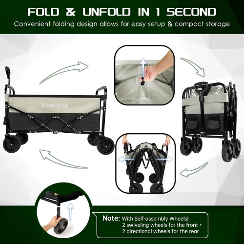- COLLAPSIBLE WAGON: Kamopot’s heavy duty utility wagon is collapsible or foldable. It can be folded or unfolded in just 1 second. Super easy to use, and convenient to put it into the car to transport or store somewhere. Please note that 4 wheels have to be self-assembled at first time of use.