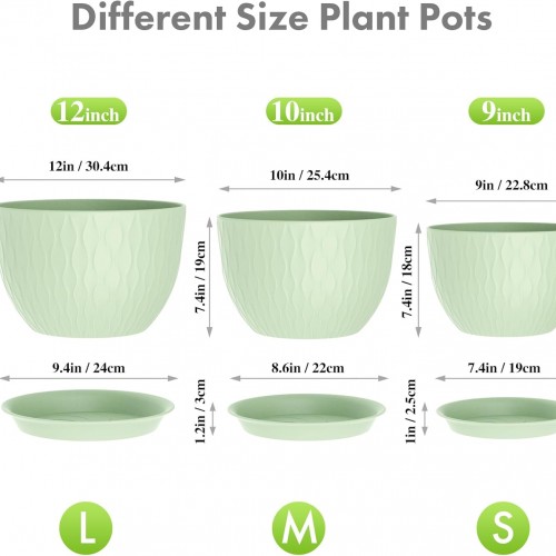 Large Flower Pots 12/10/9 inch, 3 Set Wide Plant Pots for Outdoor Indoor Plants with Water Ripples, Big Plastic Planters with Drainage Holes and Saucers for Garden House Plants, Green