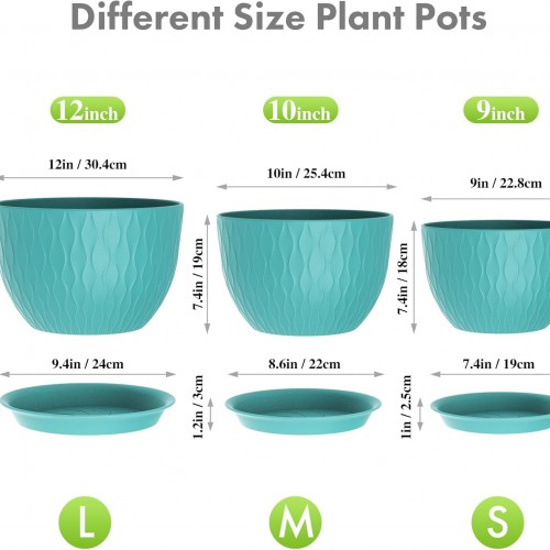 - 【Multiple Size】This plastic planter pots set includes different size pots(12″, 10″, and 9″ diameter pots), you can grow a variety of plants or flowers at one time like succulents, cactus, herbs, ZZ plant, aloe, peace lilies, as you like, creating a beautiful dream garden for you
