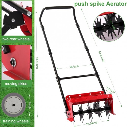 - Upgrade two height adjused rear training wheel design:our push lawn aerator add two 4inch height adjustable roller behind of aerator.One gear for transitions, easy to push or pull back to garden or warehouse.one gear for regular work,Wheels can support the ground to control the depth of penetration ,so the aerator can push smothly.one gear for deep ploughing if you need deeper penetration.