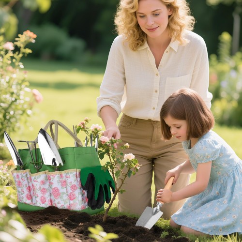 LeMotech Garden Tools Set, 10-Piece Heavy Duty Garden Hand Tools Kit with Wooden Handle, Durable Organizer Bag for Garden Supplies, Gardening Gifts for Women Grandmother, Pink Floral Pattern