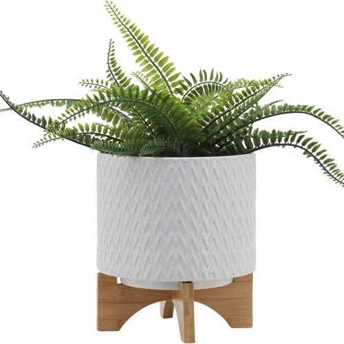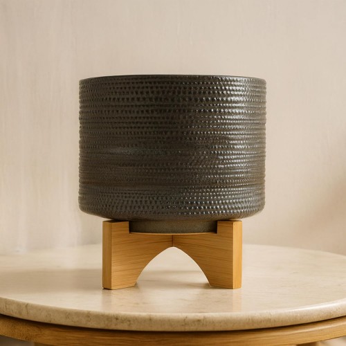 Modern Ceramic Planter with Wooden Stand – Stoneware Plant Pot Holder – Stylish Indoor & Outdoor Home Decor for Living Room, Bedroom, Office, or Garden – 9″, Gray & White