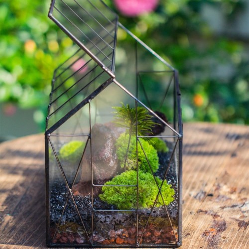 NCYP Geometric Glass Terrarium with Lid for Succulent, Small Cactus – Handmade Clear Closed House Shape Box – Home Indoor Tabletop Garden Decor, Black 9.4″ x 5.5″ x 7.3″ (No Plants)