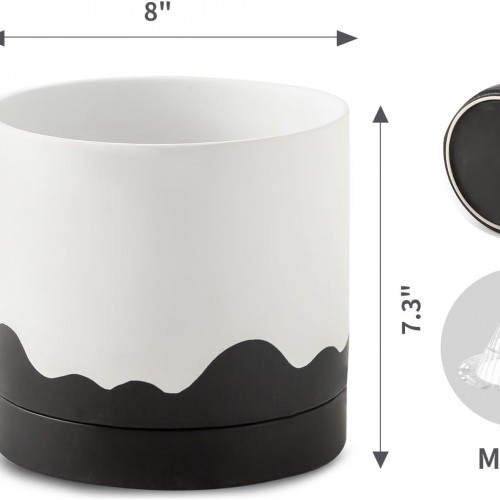 Nihow Ceramic Plant Pot: 8 Inch Planter with Drainage Hole & Saucer for Indoor & Outdoor Plants – Cylinder Round Flower Pot for Succulent/Herbs/Violets – White & Wave Black