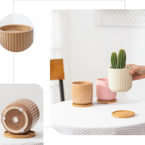 OMAYKEY 4 Inch Ceramic Plant Pot with Saucer, Adorable Stripe Multicolor Small Planters Pots with Drainage Hole & Mesh Pads for Succulent, Snake Plants, Cactus, Herbs – Set of 4