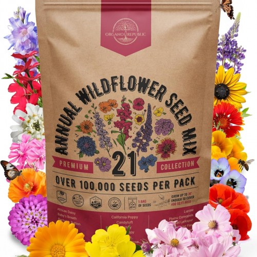 Organo Republic 23 Wildflower Seeds Annual & Perennial Mix for Indoor & Outdoors, Attract Birds & Butterflies 100,000+ Non-GMO, Heirloom Garden Seeds, 4oz Packet for Growing Wild Flowers