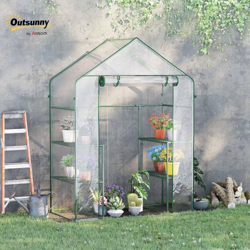 Outsunny 5′ x 2.5′ x 6.5′ Mini Walk-in Greenhouse Kit, Portable Green House with 3 Tier Shelves, Roll-Up Door, and Weatherized Plastic Cover for Backyard Garden, Clear