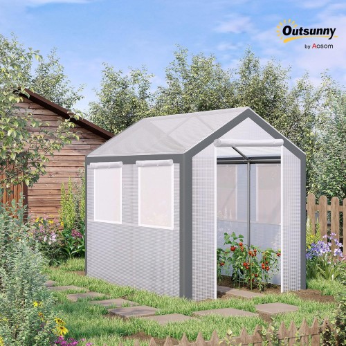 Outsunny 8′ x 6′ x 7′ Walk-in Greenhouse, Outdoor Garden Warm Hot House with 4 Roll-up Windows, 2 Zippered Doors and Weather Cover, White