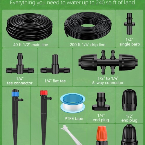 Pawfly 240 ft Drip Irrigation System for Garden, Drip Irrigation Kit with 40ft 1/2″ & 200ft 1/4″ Tubing Adjustable Emitters Fittings and Accessories, Garden Watering System for Greenhouse Lawn Yard