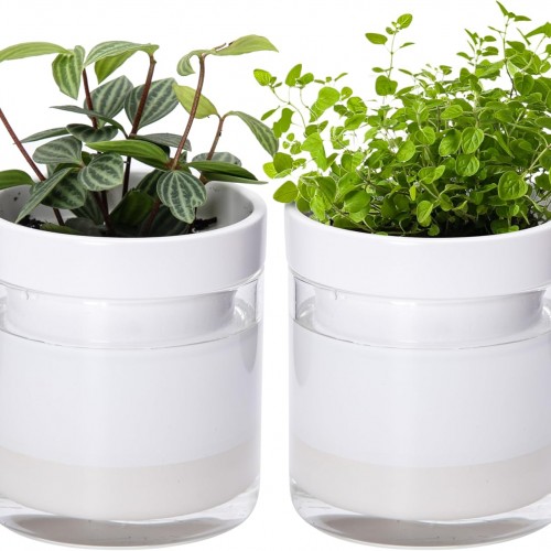 Phoenix Vine 6 Inch Self Watering Planter, White Terracotta Clay Pot with Glass Reservoir for Indoor Plants, Herbs, Flowers, Set of 2, 52-B-F-2