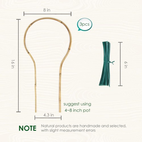 - PACKAGE & INSTALLATION: You’ll get 3 pack 16 in bamboo trellises and a pack of twist ties, the diameter of the loop is 8.0 inches. Just insert the bottom of the house plant trellis into the soil and your climbers plants will wrap around the bamboo trellis to prevent them from falling or breaking.(Handmade products, measurement tolerance range: ≤±0.8 inches)