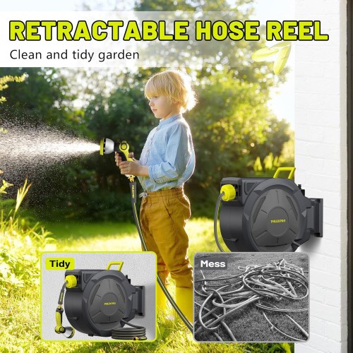 - ใ๐จ๐ฉ๐ ๐ซ๐๐๐๐ ๐๐๐ฌ๐ข๐ ๐ง ๐๐จ๐ฌ๐ ๐ฅ๐๐๐ฅใ: PHLEX PRO hose reel offers versatile hose use with a pull-and-lock system to prevent retraction. After use, gently tug to engage the automatic rewind, which neatly organizes the hose for you. Swivel bracket and fixed metal pin, can be securely mounted on a solid wall, offering a 180-degree swivel for versatile, all-around watering.