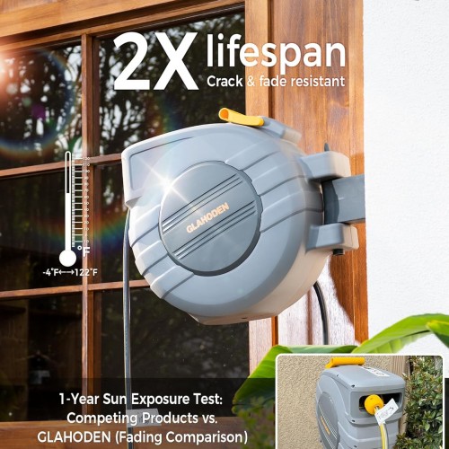 - Precision Dual Ratchet Locking (Patent: US011319184B2): GLAHODEN’s auto rewind water hose reel passes 3,000 rigorous tests with ±0.65 ft locking accuracy. 50% more durable than traditional locks, it eliminates hose slack and secures exact lengths, ensuring precise positioning at balcony corners or garden edges without dragging excess hose